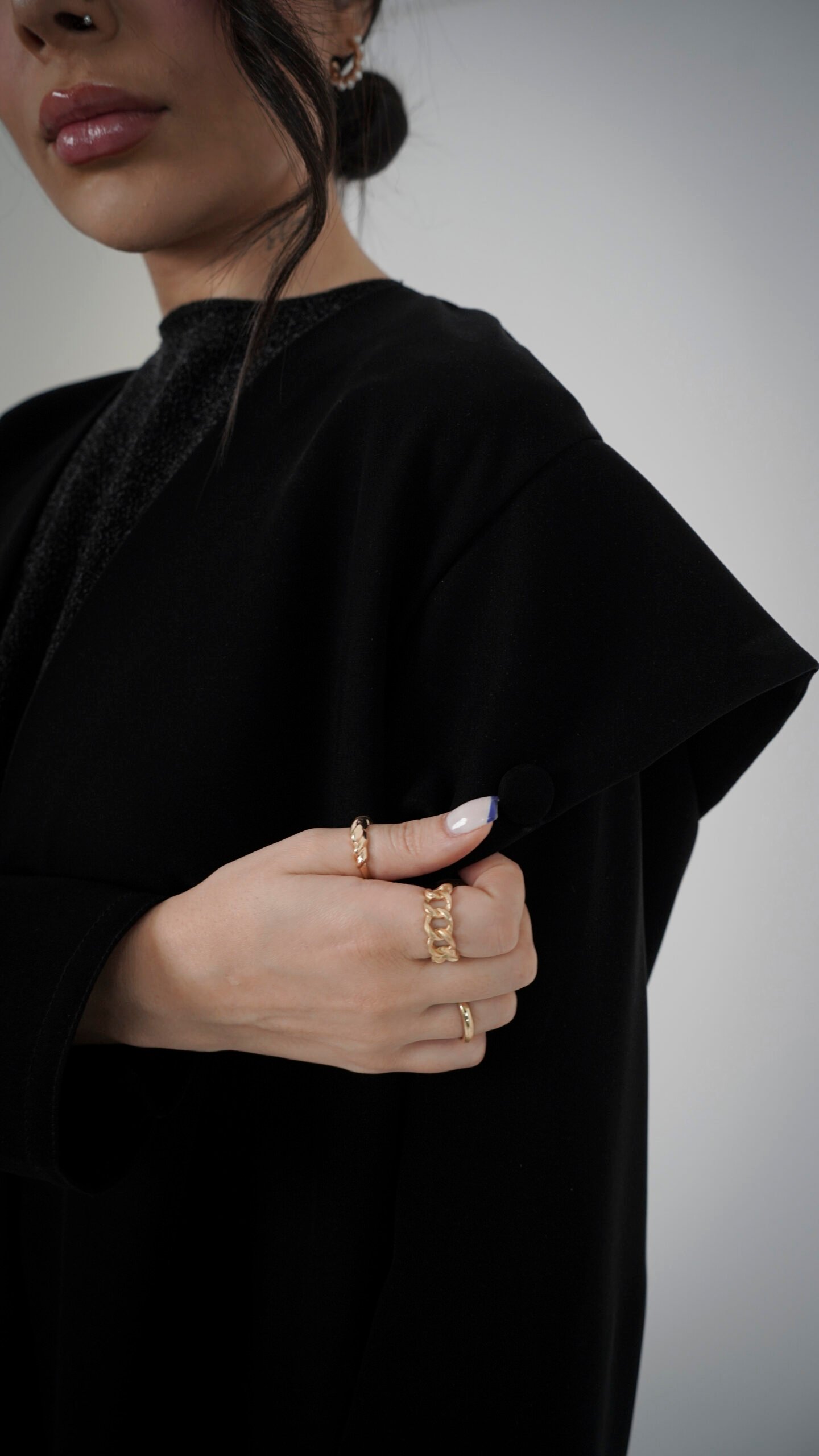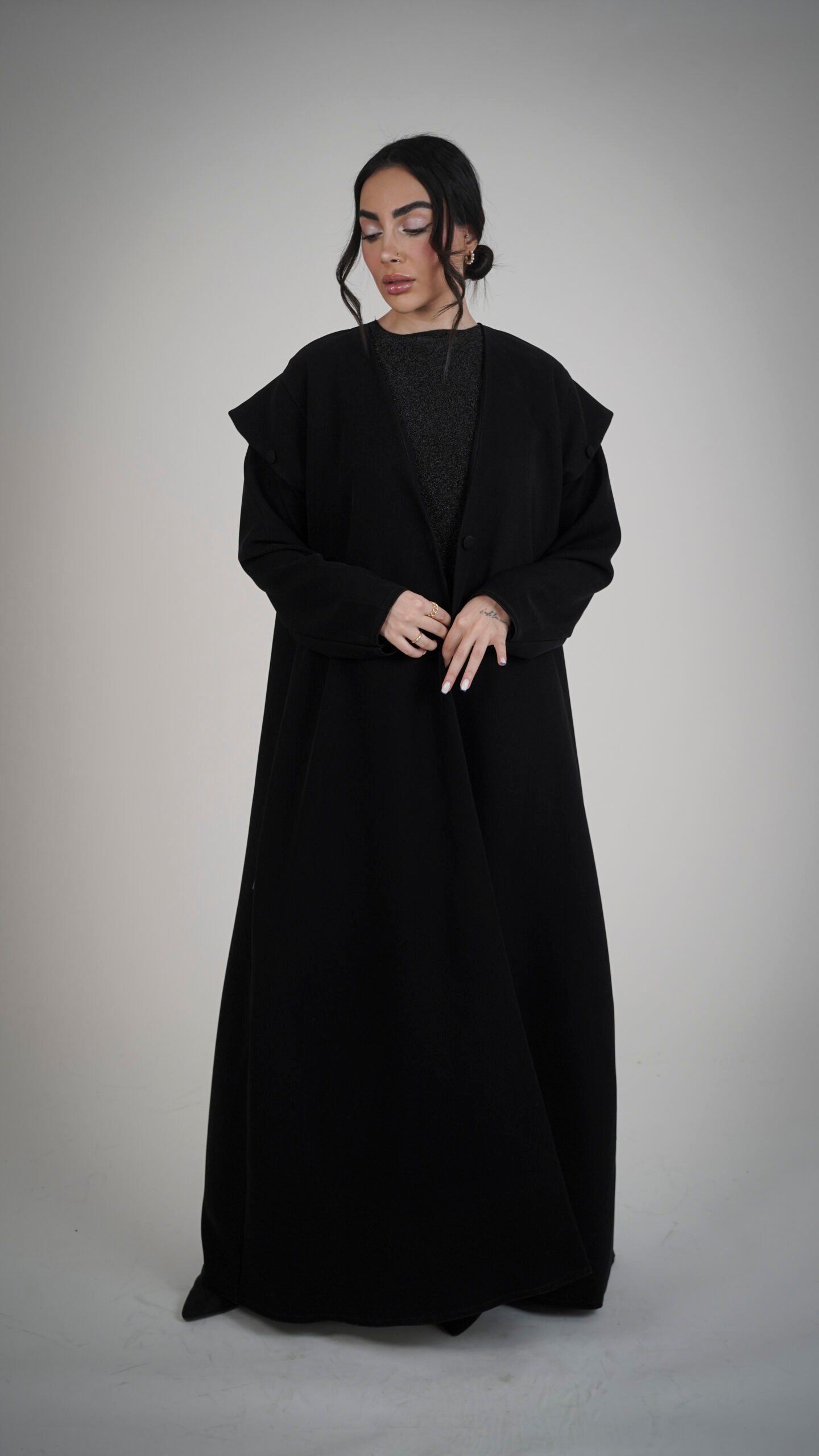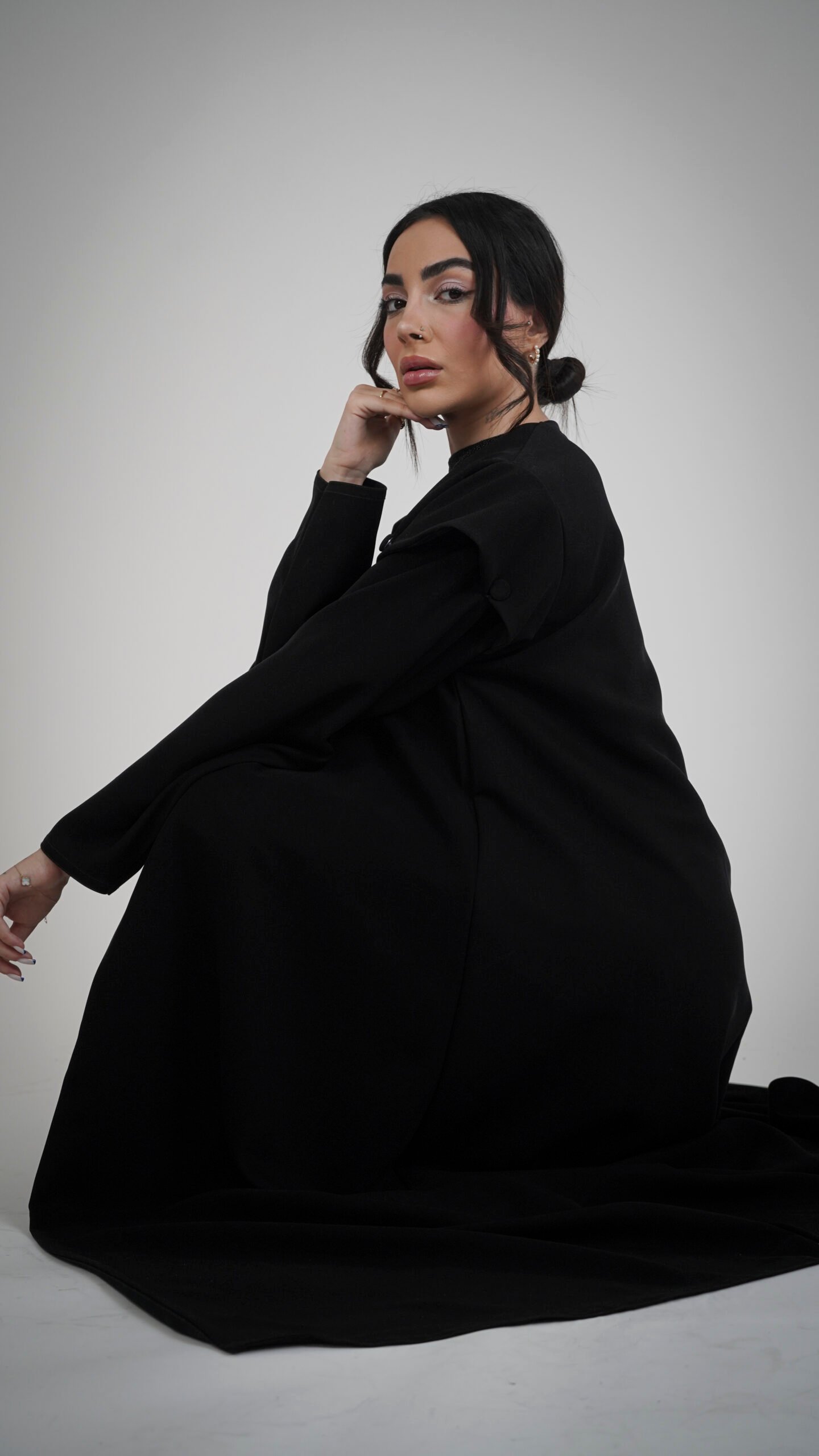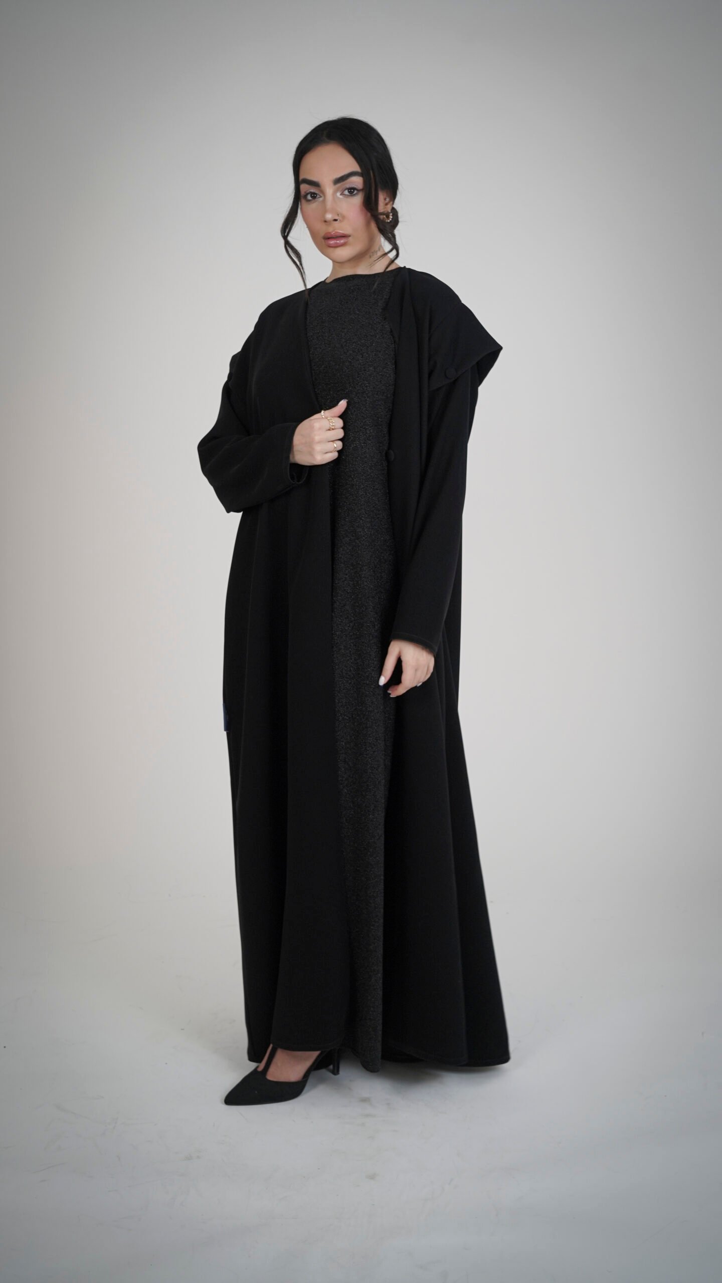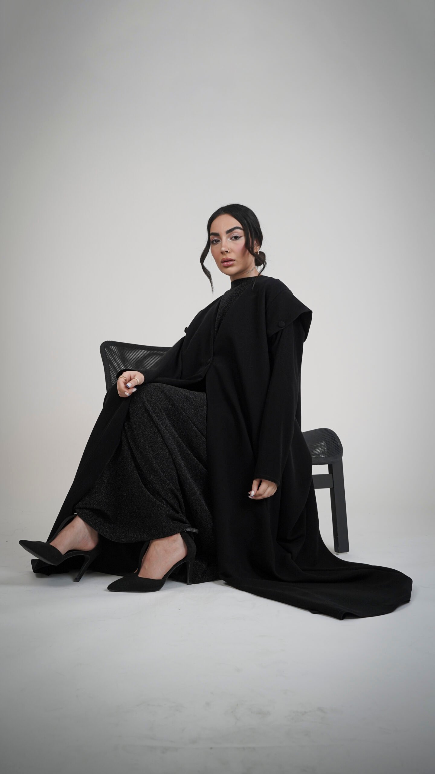 • عباية اسود سادة تمنحك قصّتها الواسعة راحة كبيرة أثناء الحركة مع مظهر محتشم يليق بالارتداء اليومي أو الرسمي.