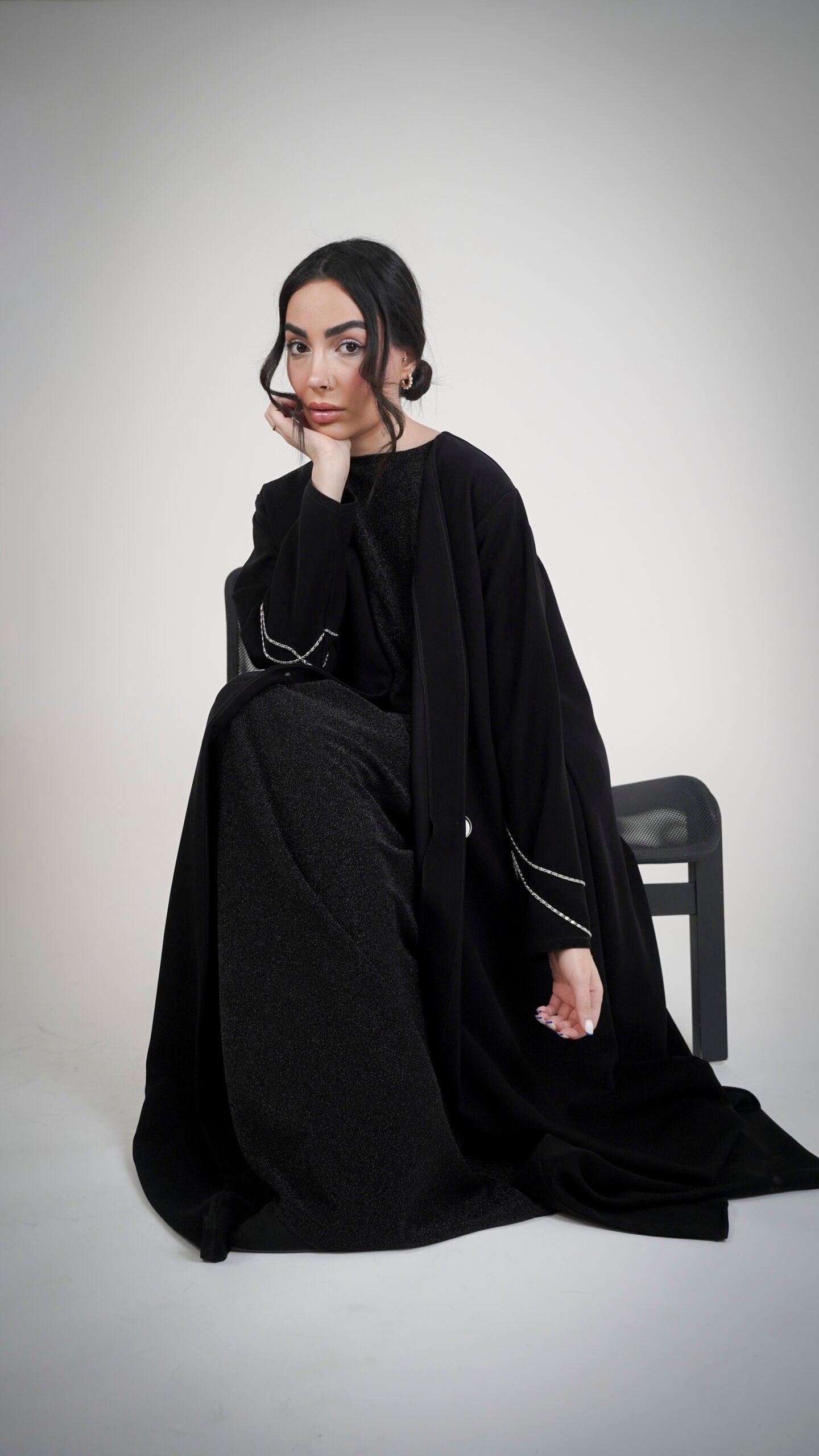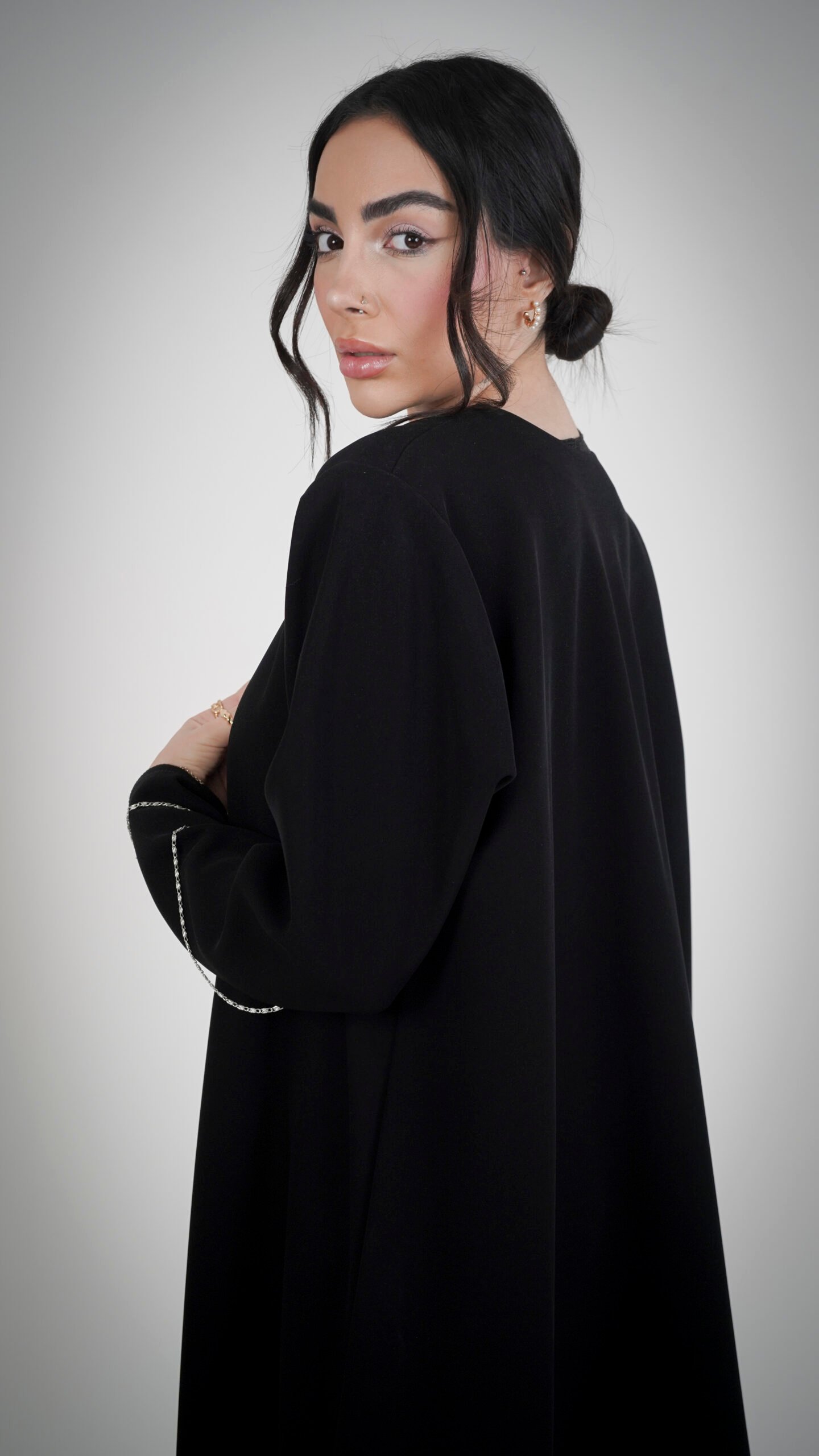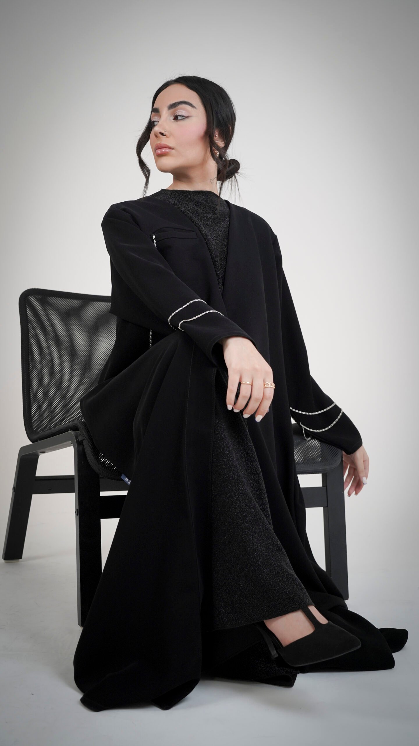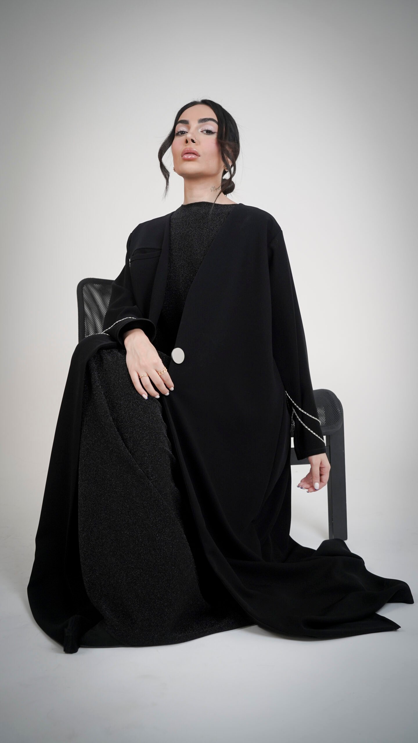 - الخطوط الفضية الناعمة على الأكمام تضيف لمسة بريق هادئة تعكس ذوق المرأة الهادئة والأنيقة.