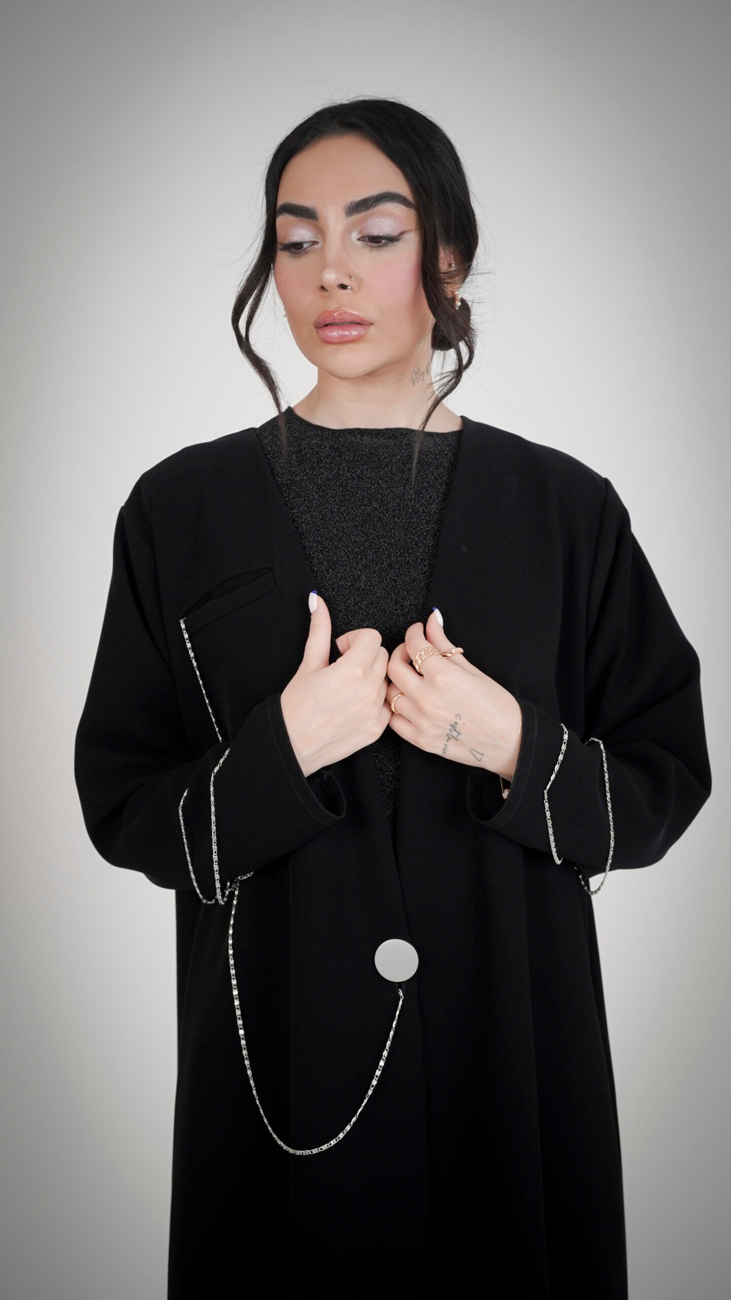 - التصميم : قصّة مستقيمة مع خطوط فضية ناعمة على الأكمام وسلسلة فاخرة على الزر الأمامي.